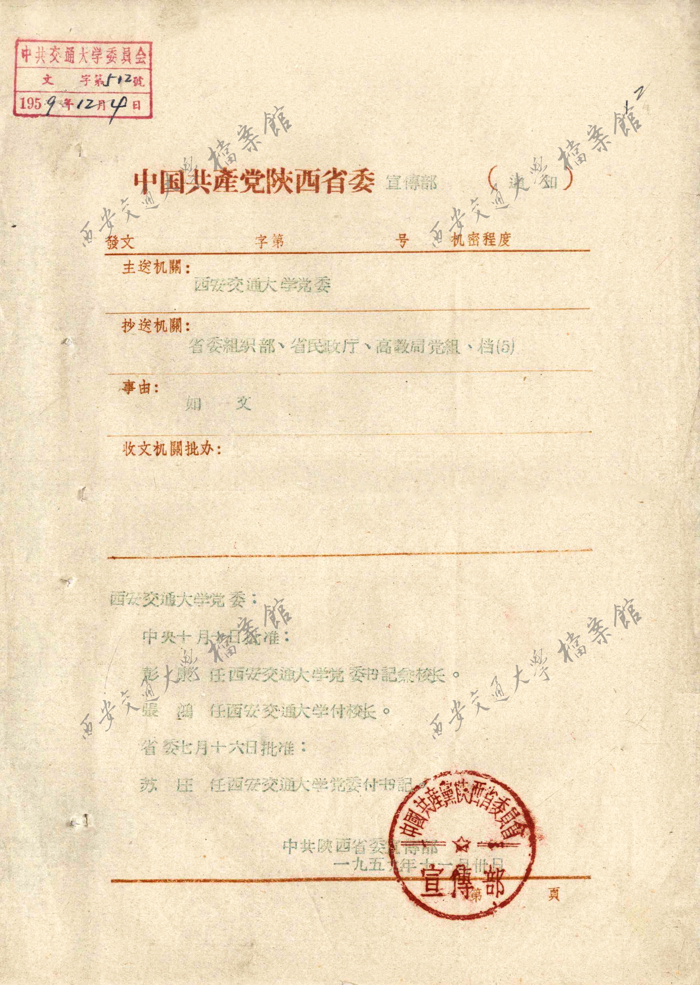 中共陕西省委宣传部关于批准彭康任西安交通大学党委书记兼校长的通知(1959年11月20日)