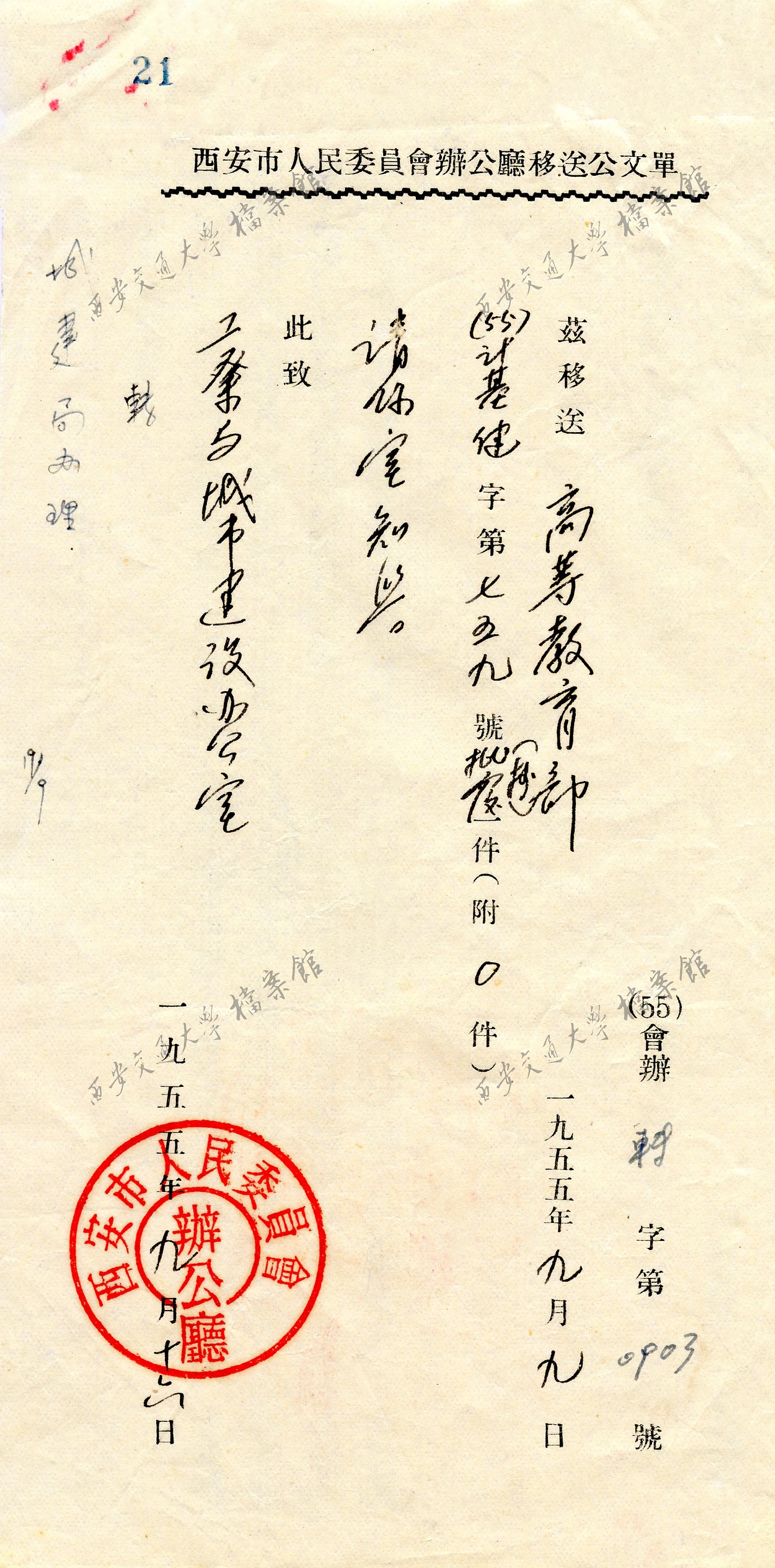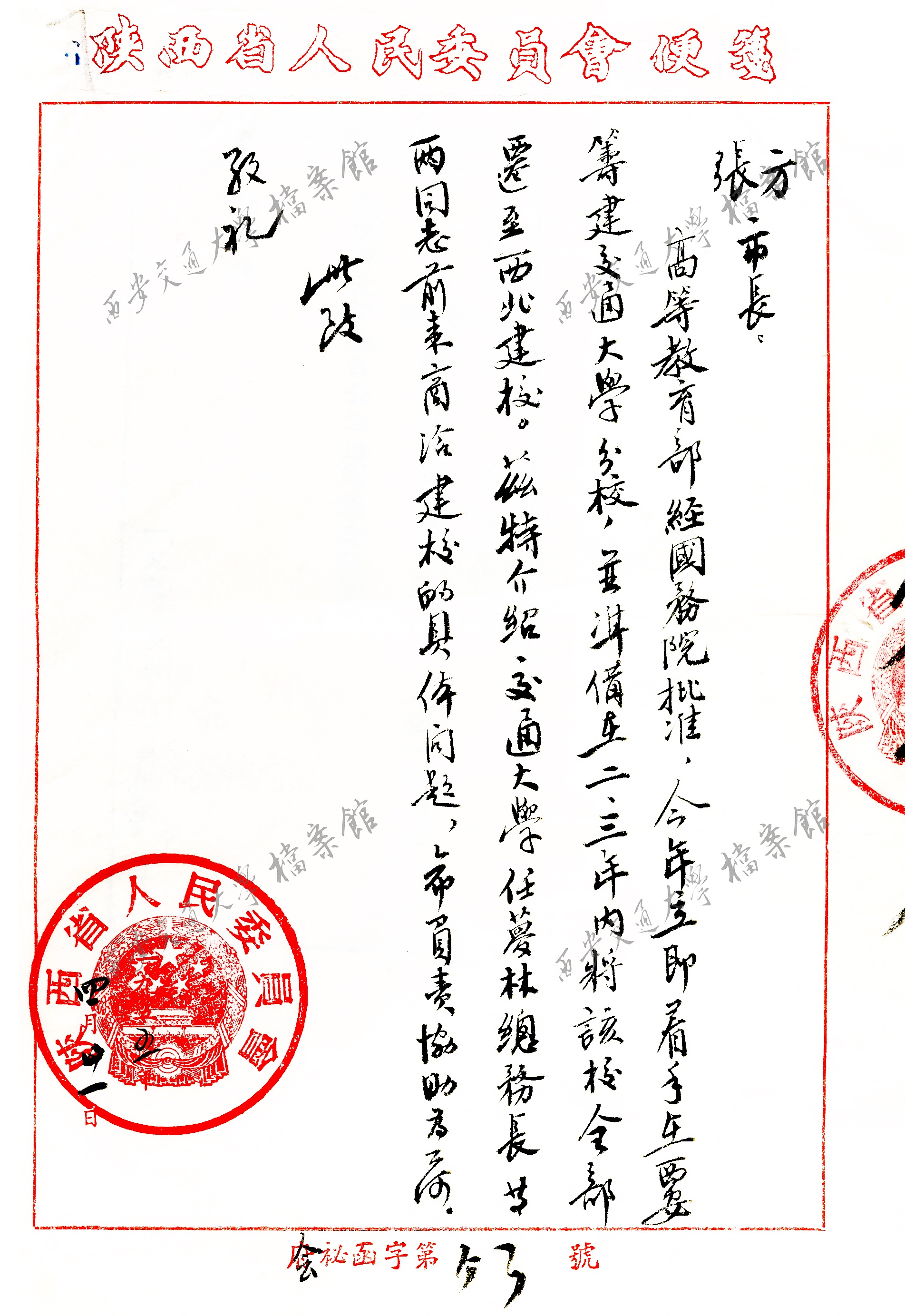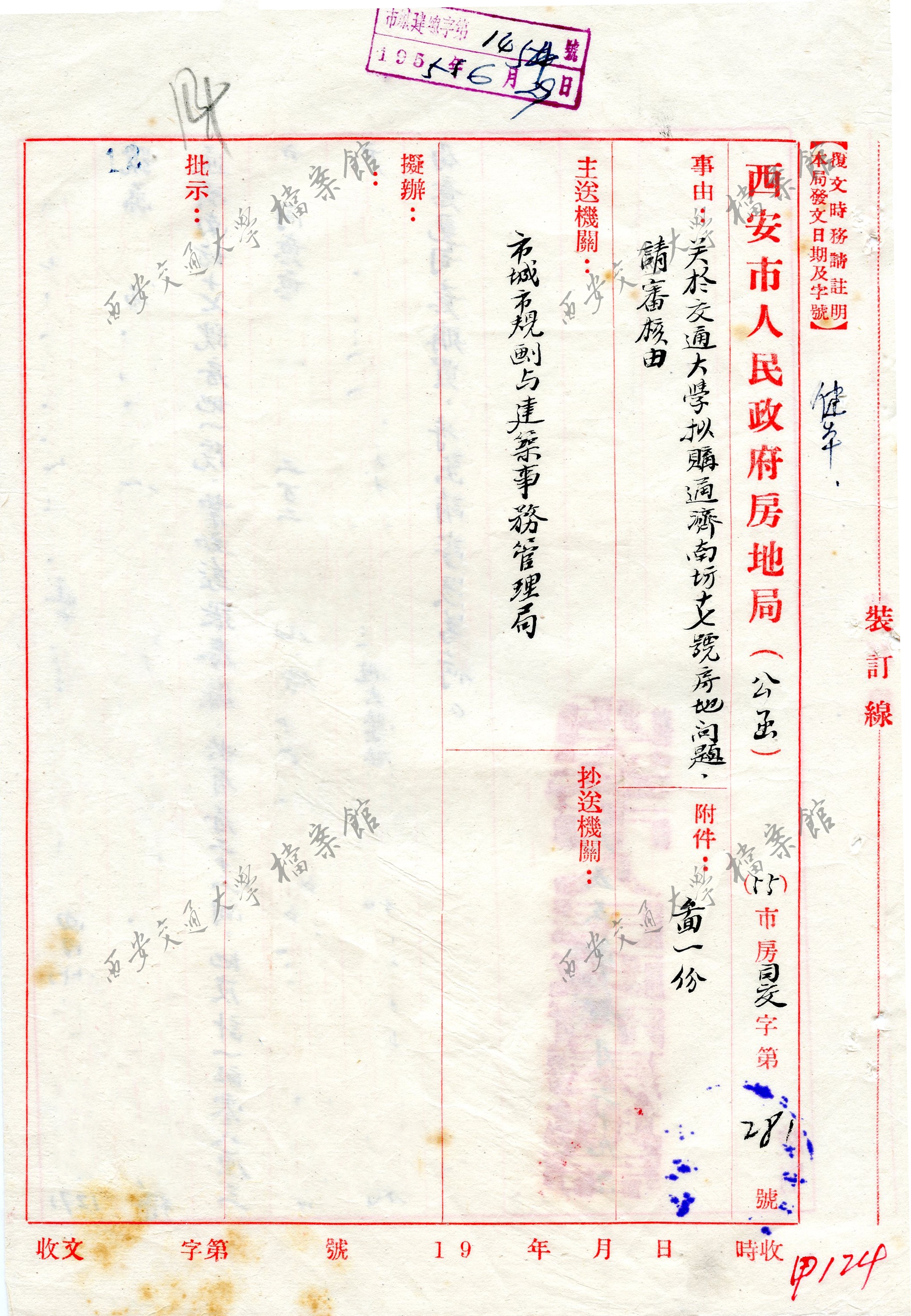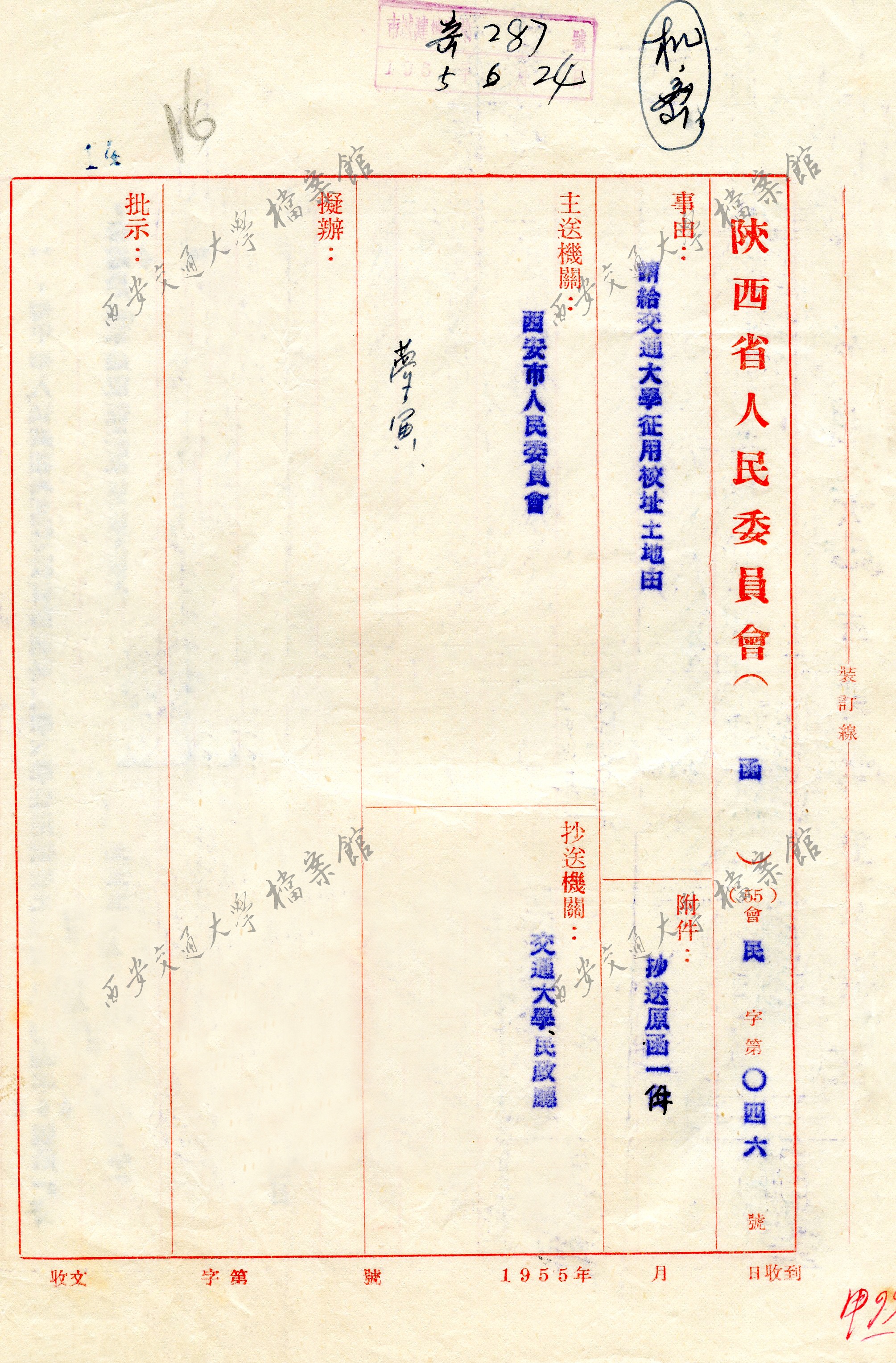陕西省政府函西安市人民委员会: 转发教育部关于请给交通大学征地建校土地由(1955年6月24日)