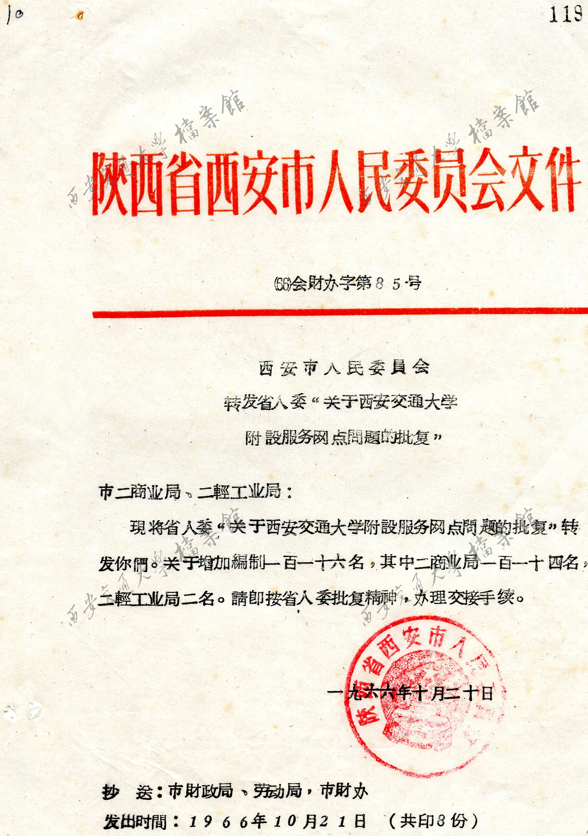 西安市人民委员会关于转发省人委“关于西安交通大学附设服务网点问题的批复”(1966年10月20日)