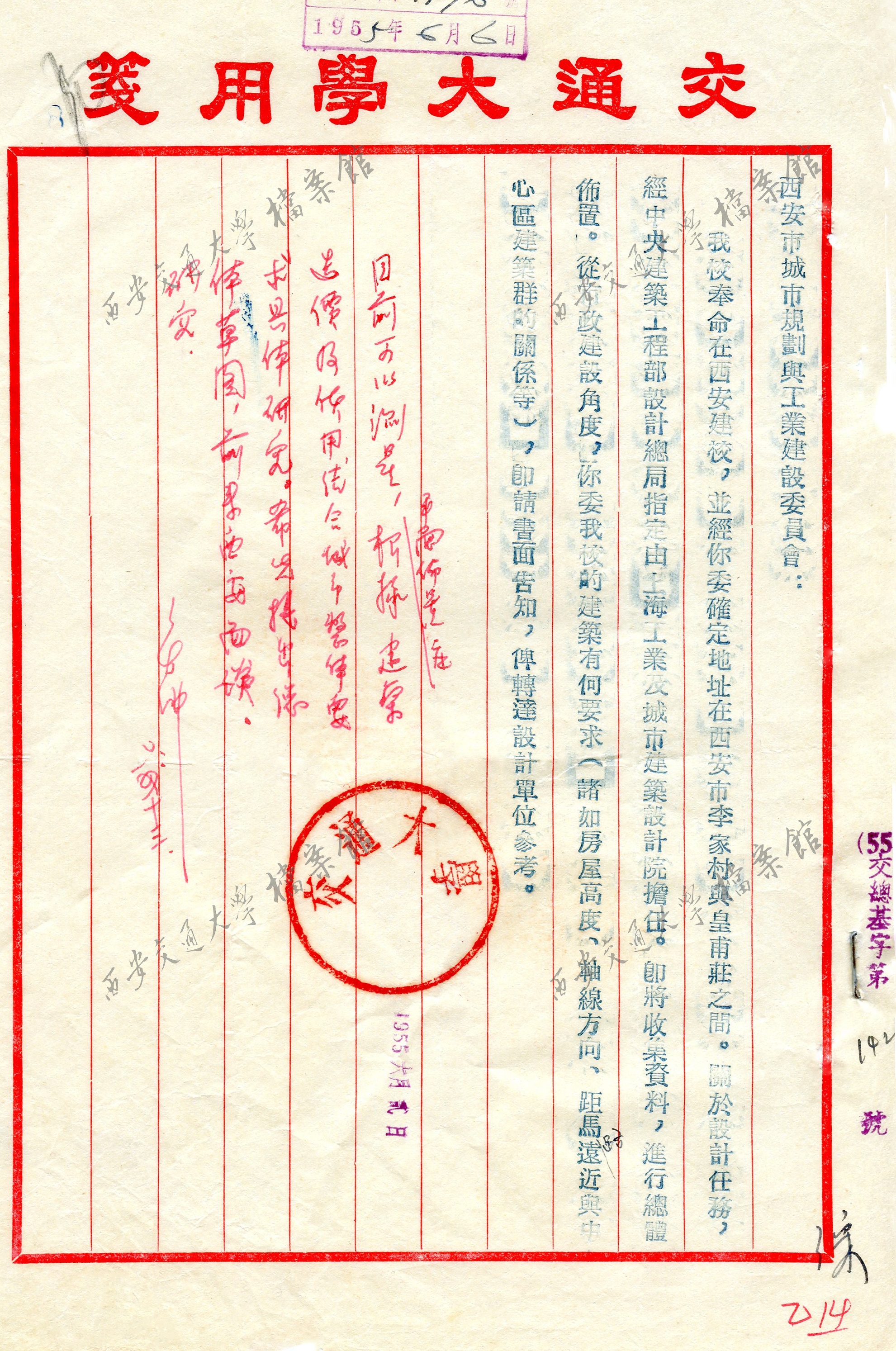 我校给西安市城市规划与工业建设委员会关于交大西安校园建设总体要求的函及回复意见(1955年6月2日)