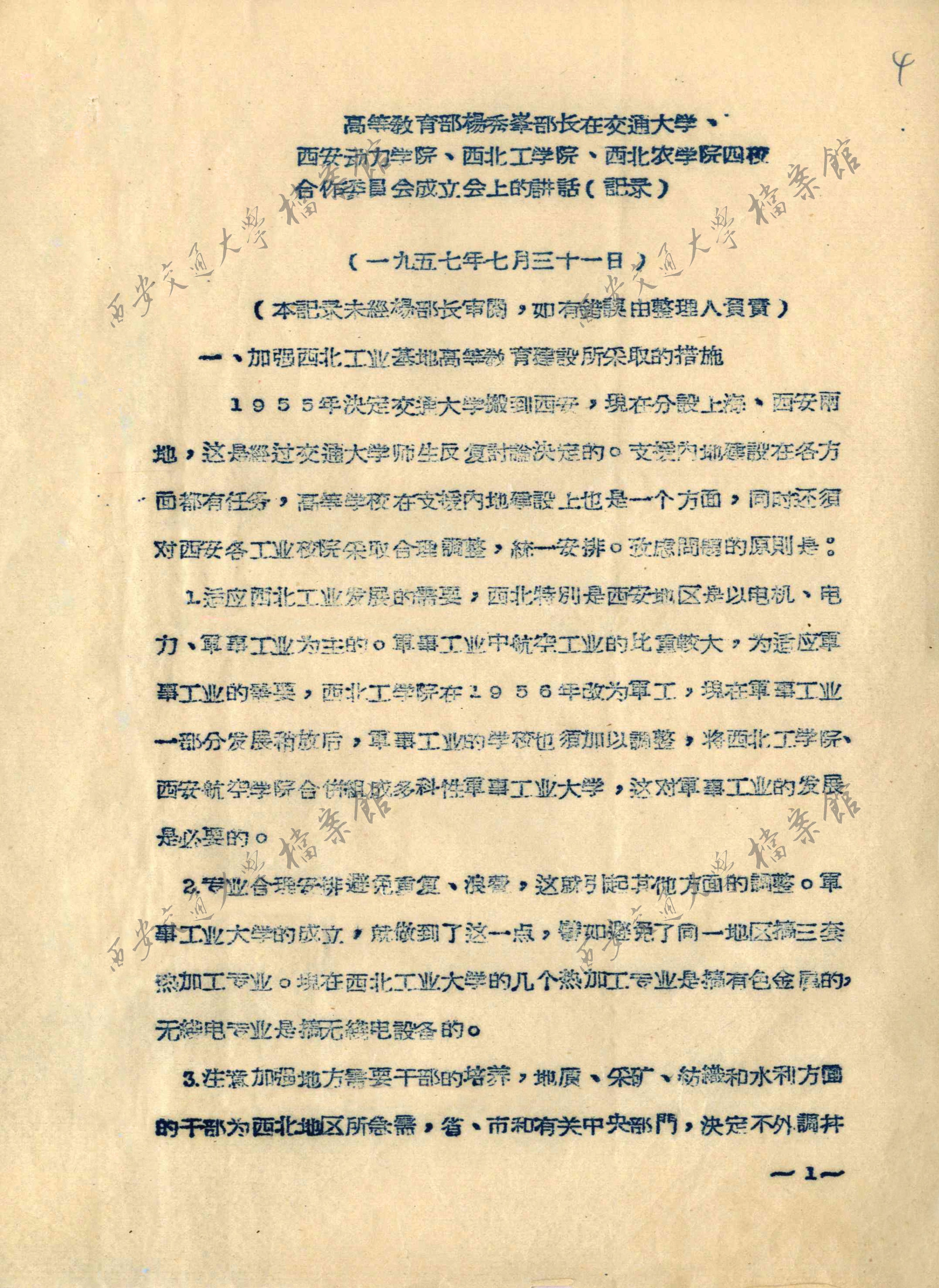 高教部杨秀峰部长在交大西动西工西农四校合作委员会上讲话(1957年7月31日)