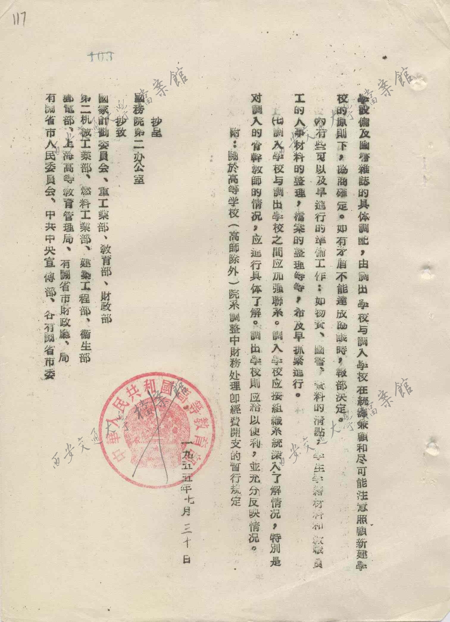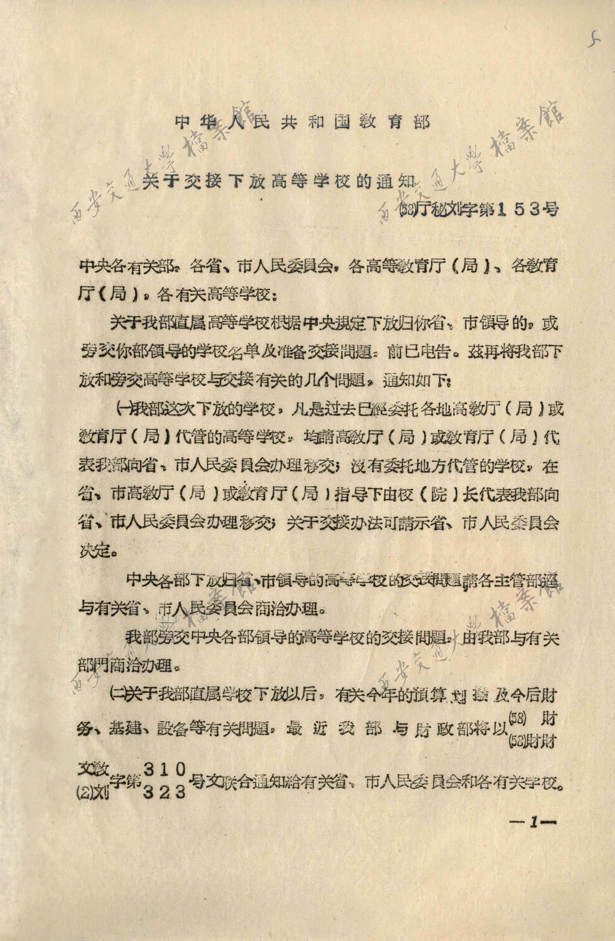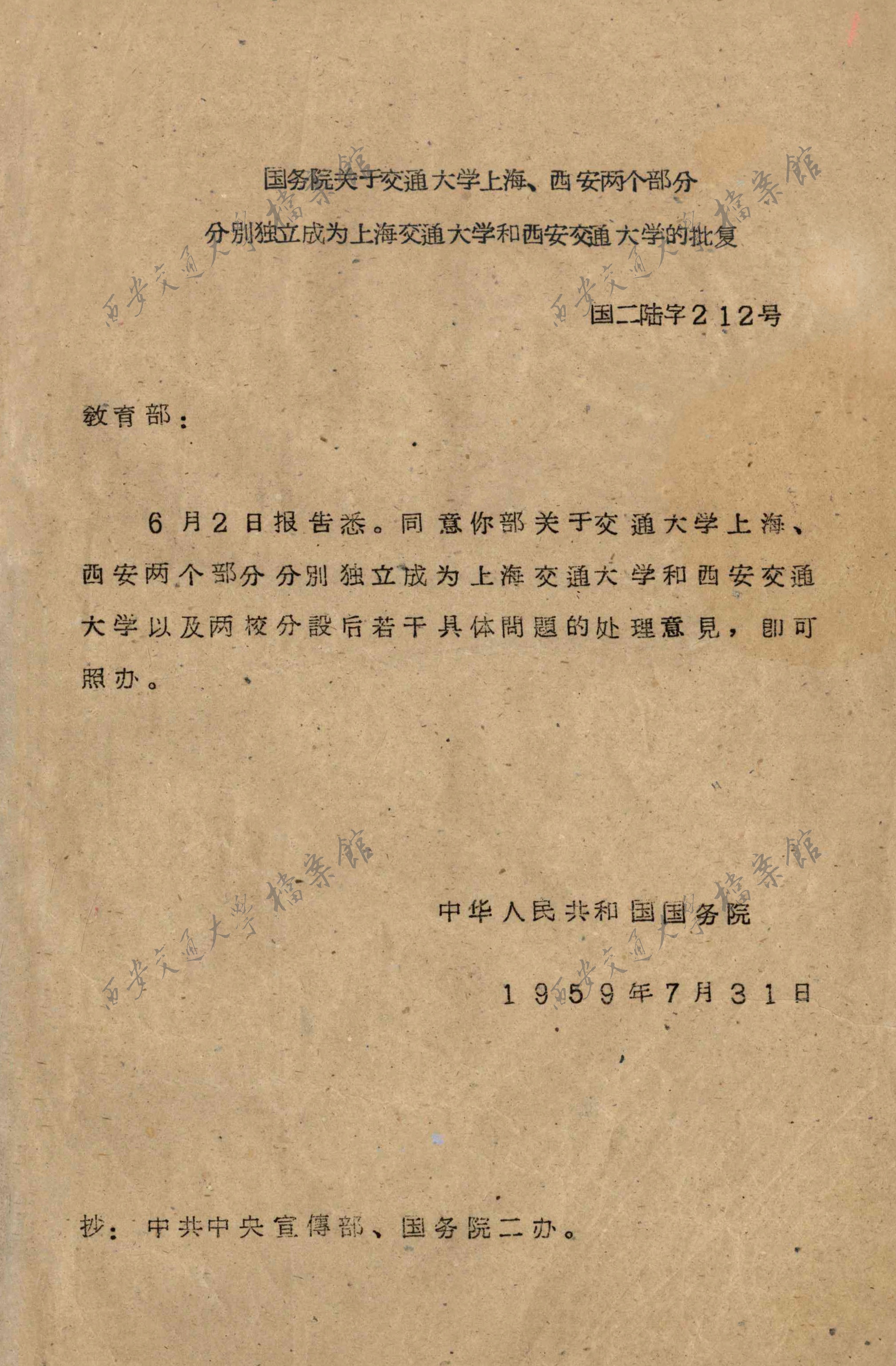 国务院关于交通大学上海、西安两个部分分别独立成校的批复及教育部的报告(1959年7月31日)