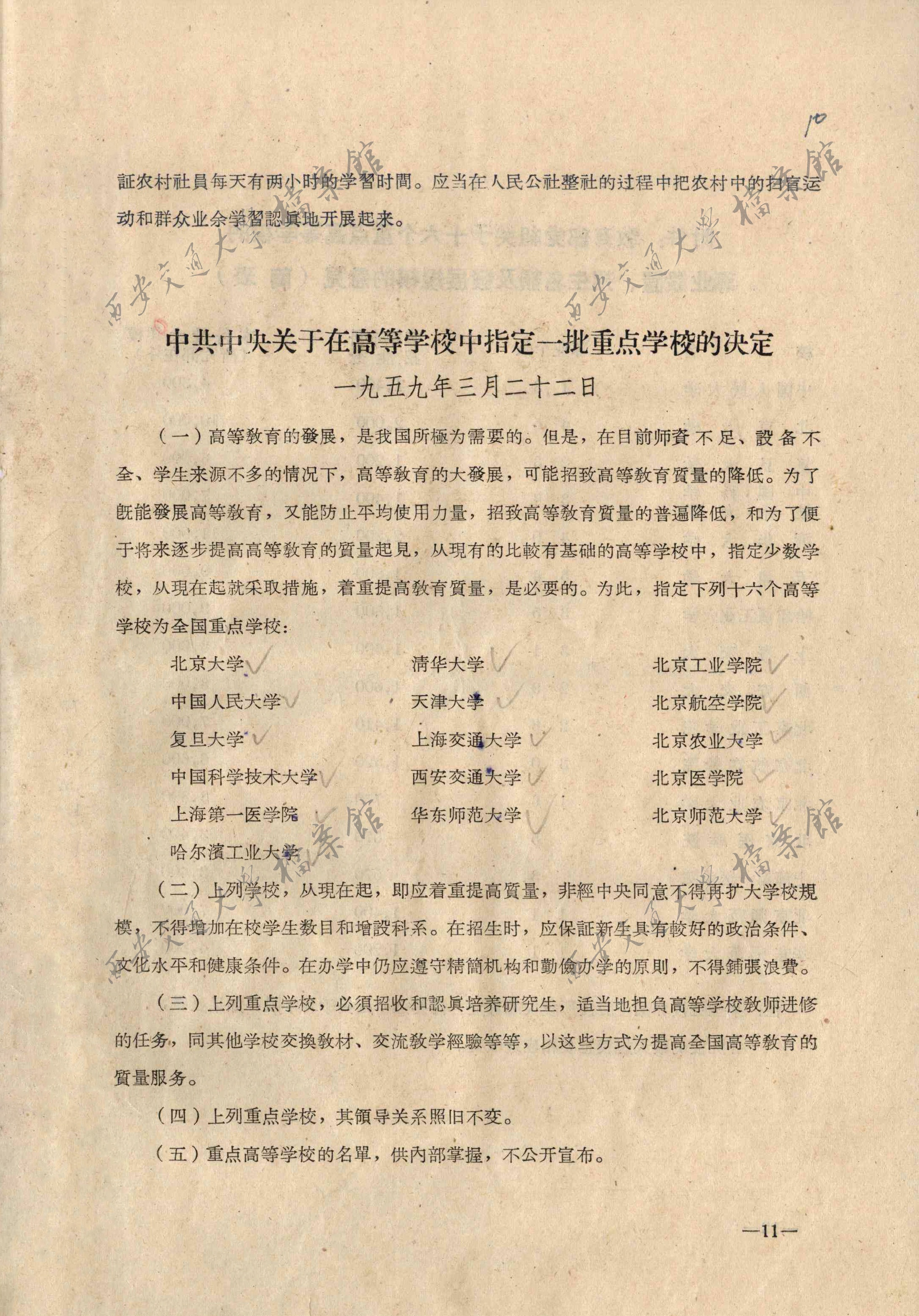 中共中央关于在高等学校中指定第一批重点学校的决定(1959年3月22日)