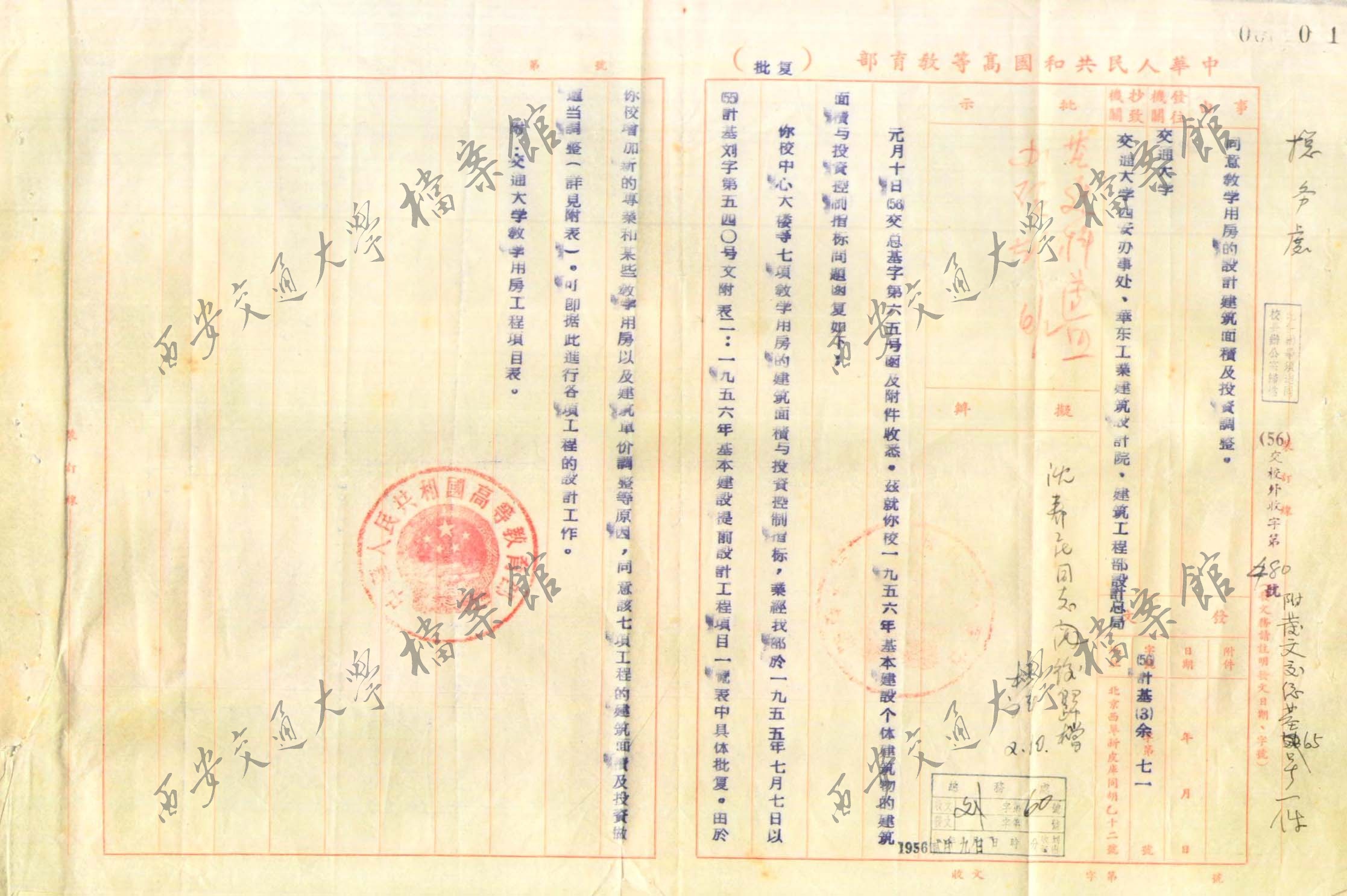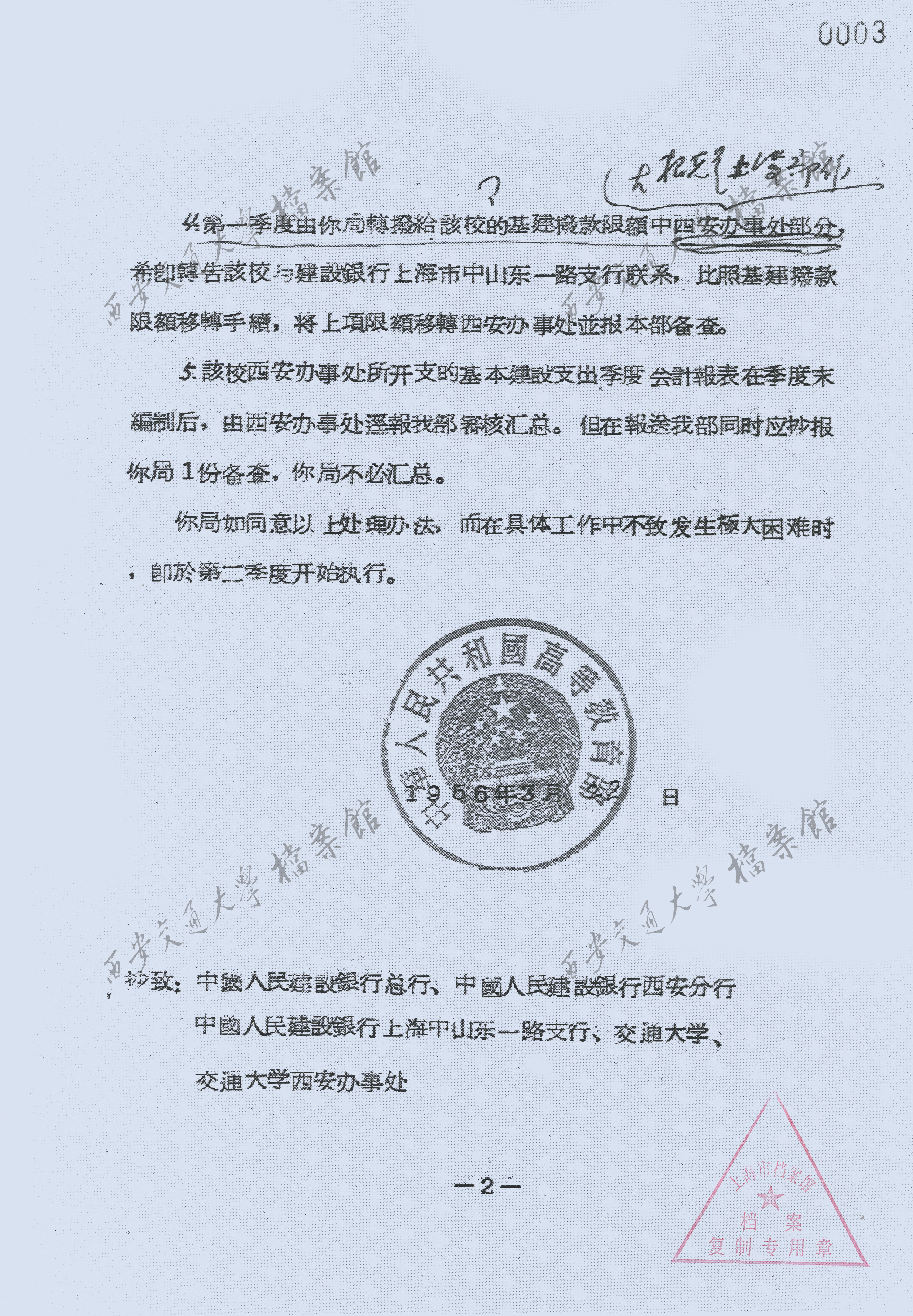 高等教育部关于上海交通大学和该校西安办事处基本建设拨款问题的处理办法(1956年3月22日)