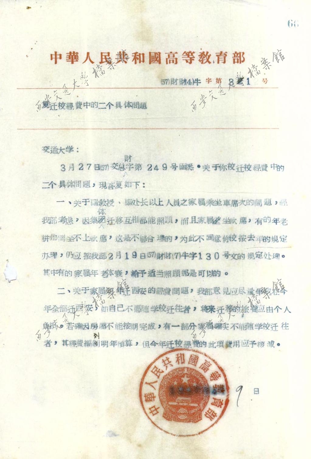 高教部复迁校经费中的两个具体问题 (1957年4月9日)