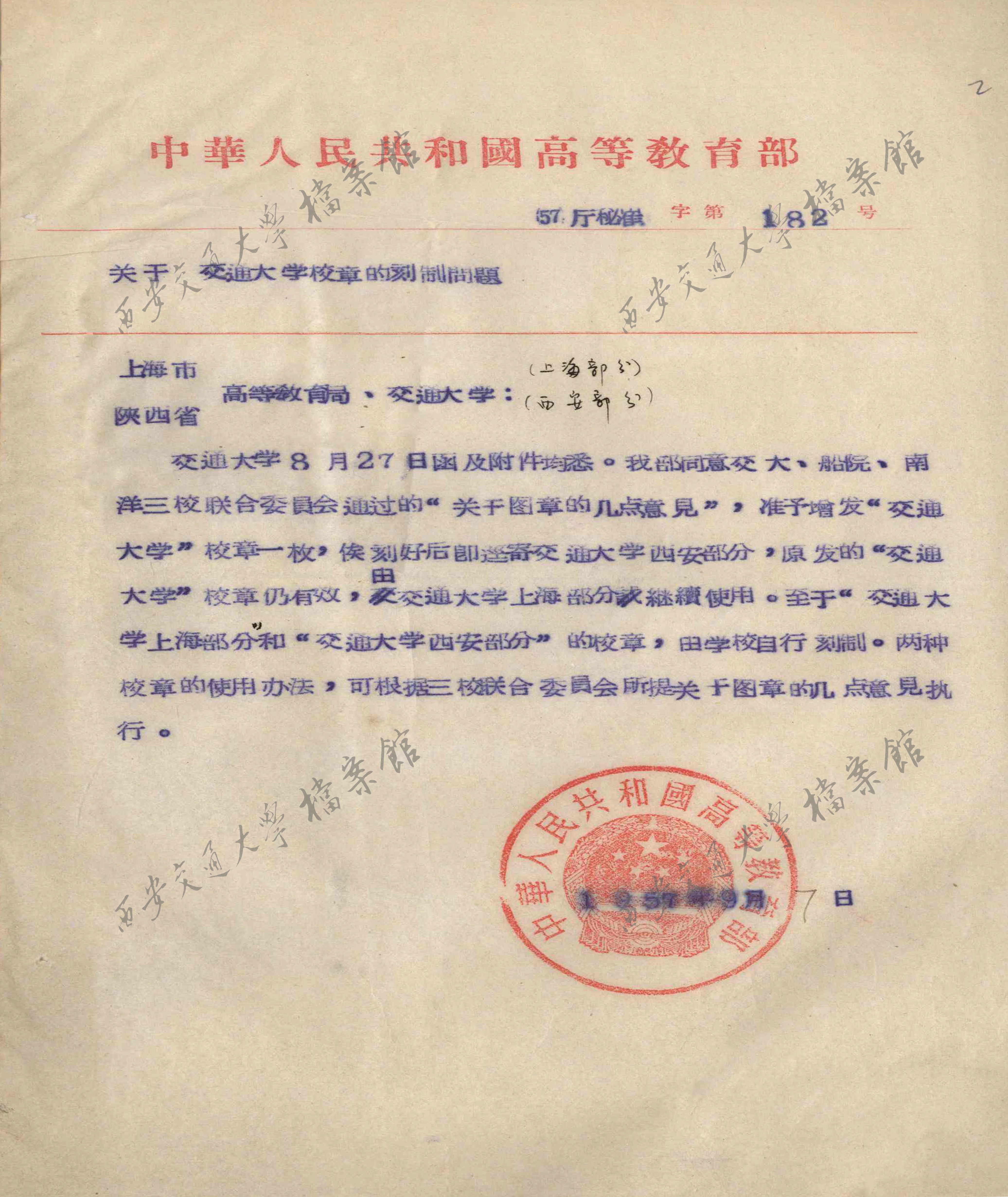 高教部关于交通大学校章的刻制问题(1957年9月7日)