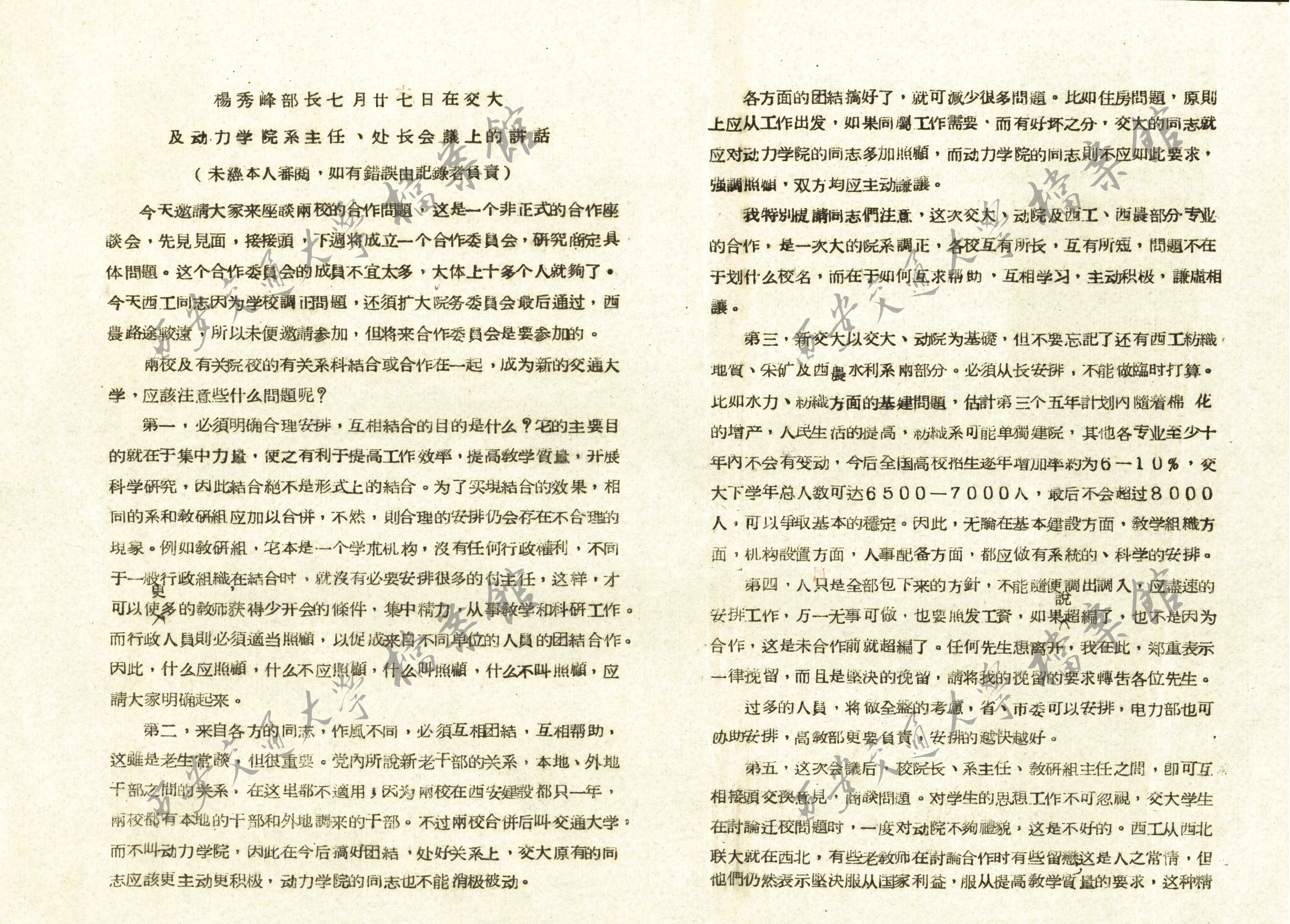 杨秀峰部长7月27日在交大及动力学院系主任、处长会议上的讲话(1957年7月29日)