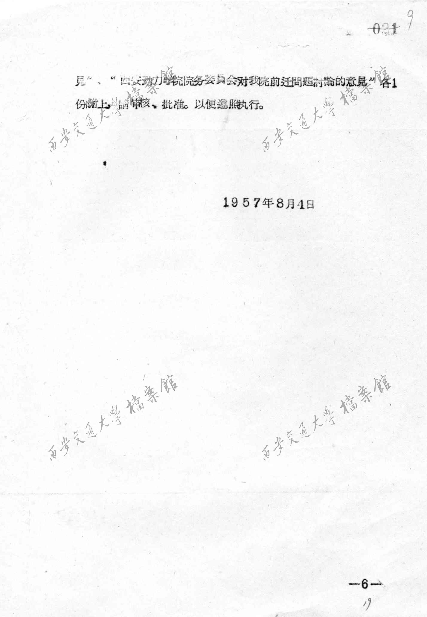 高教部杨秀峰部长关于处理交通大学迁校问题和上海、西安几所工科院校调整工作的报告(1957年8月19日)