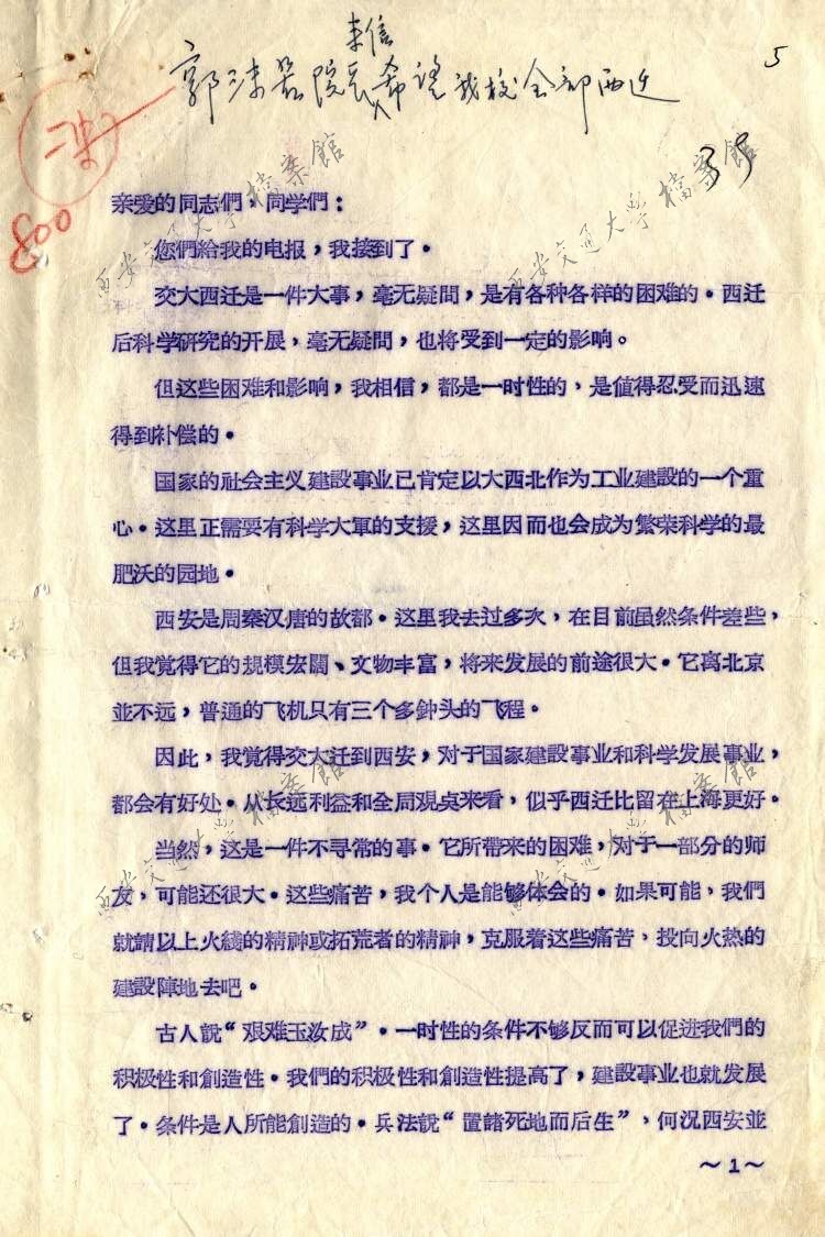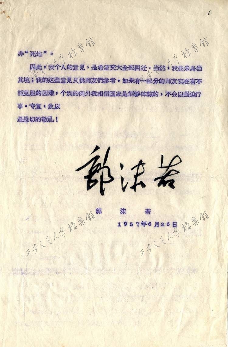 郭沫若院长来信支持交通大学全部西迁(1957年6月26日)