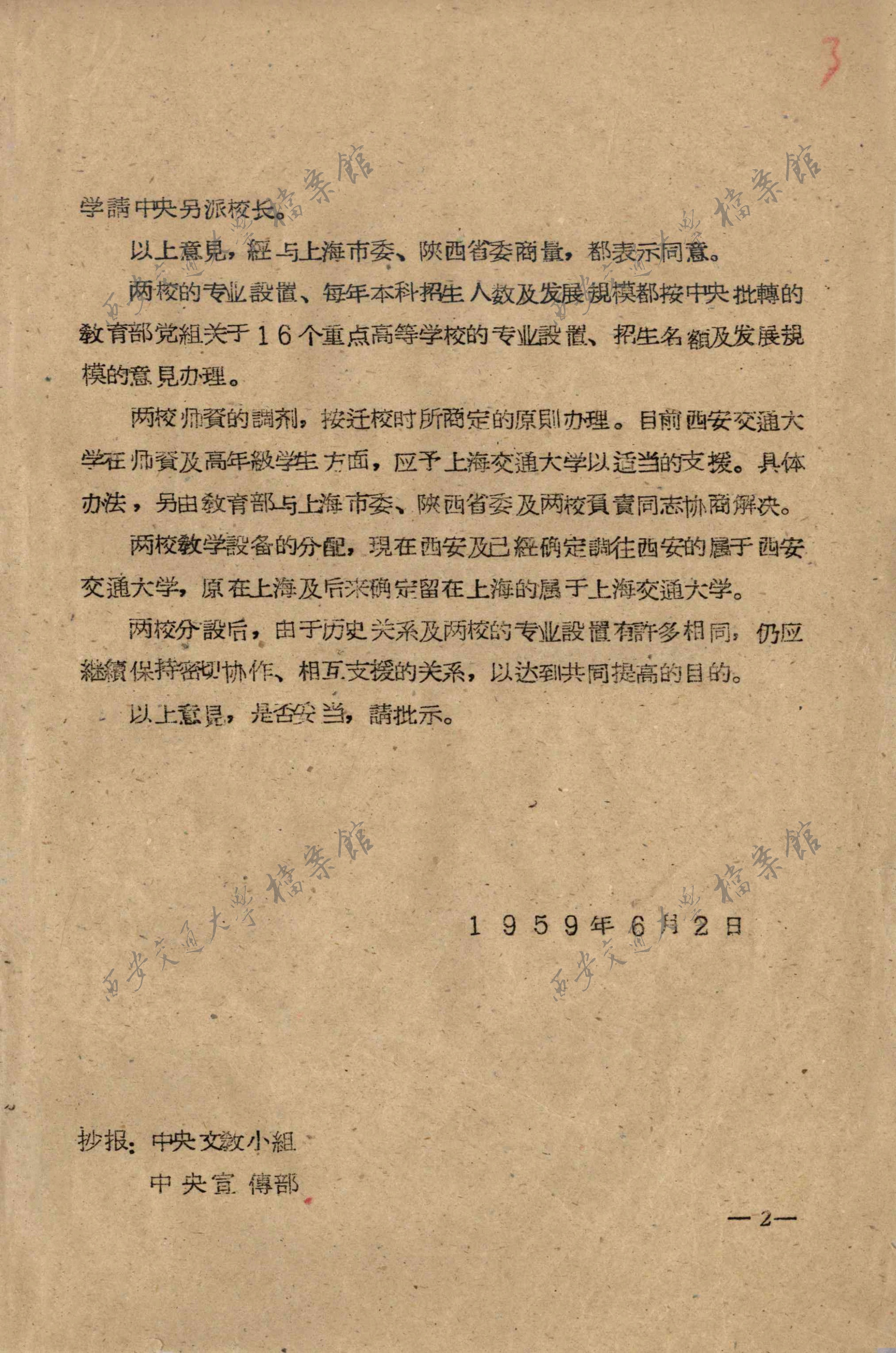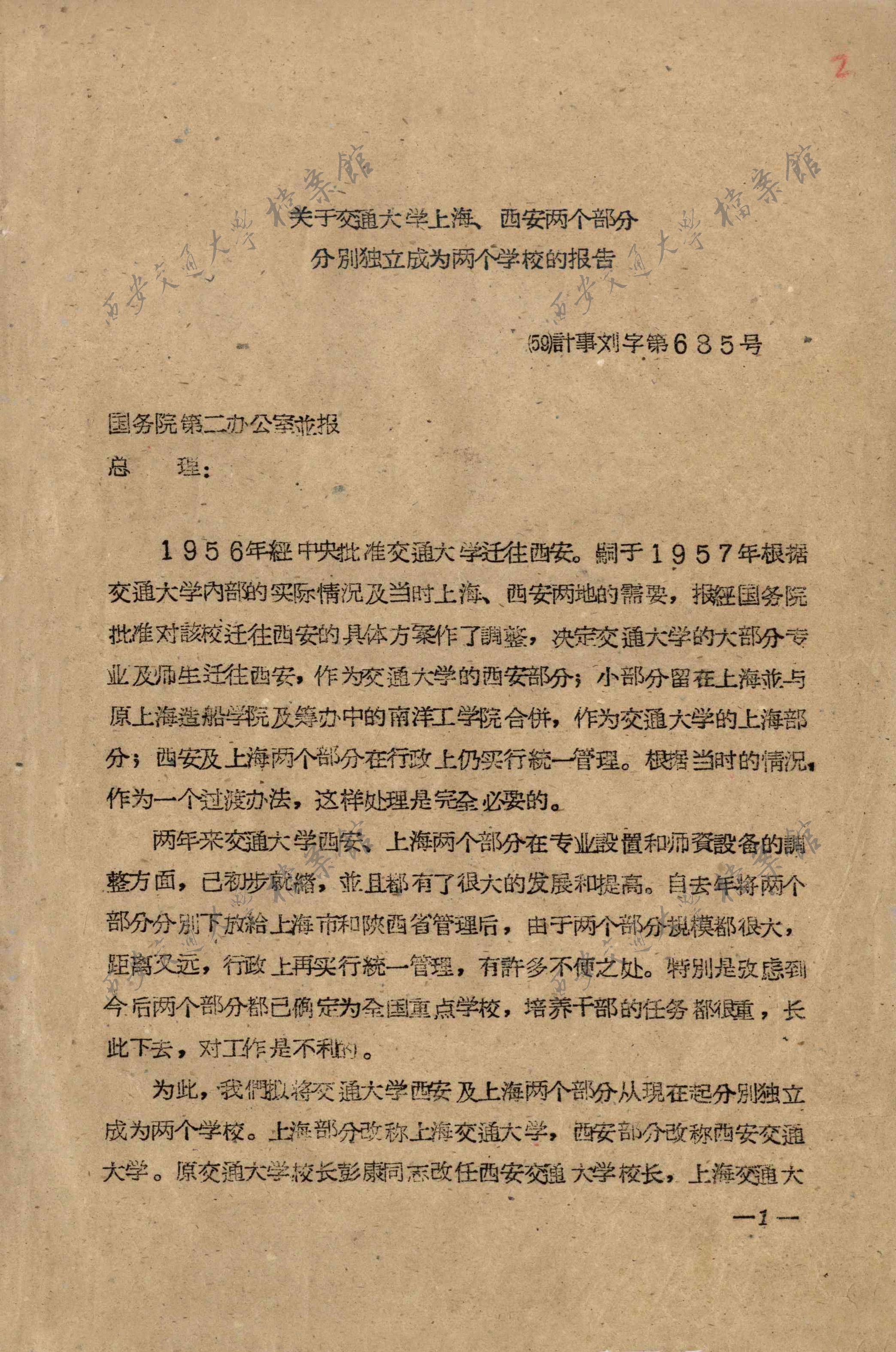 国务院关于交通大学上海、西安两个部分分别独立成校的批复及教育部的报告(1959年7月31日)