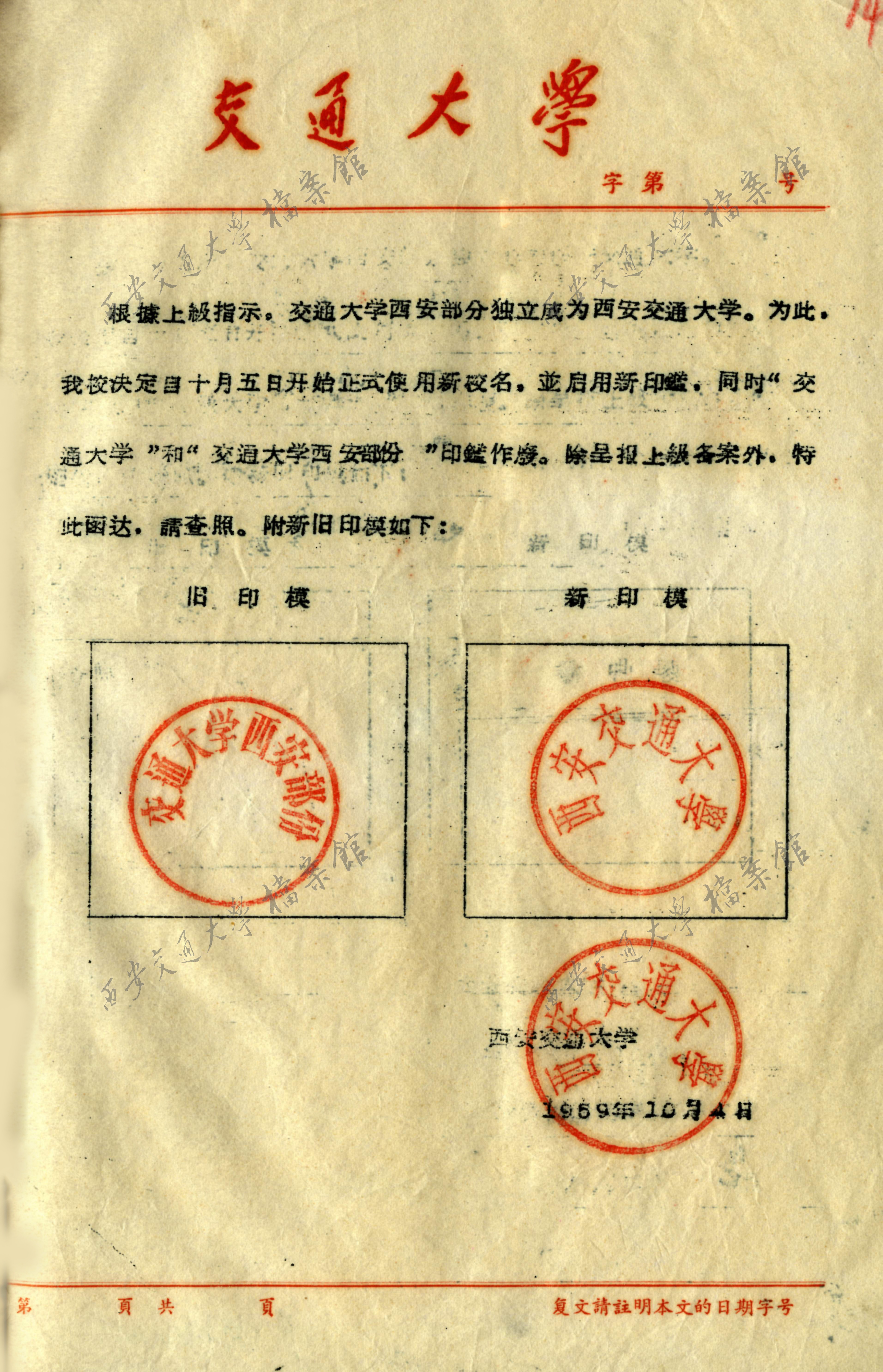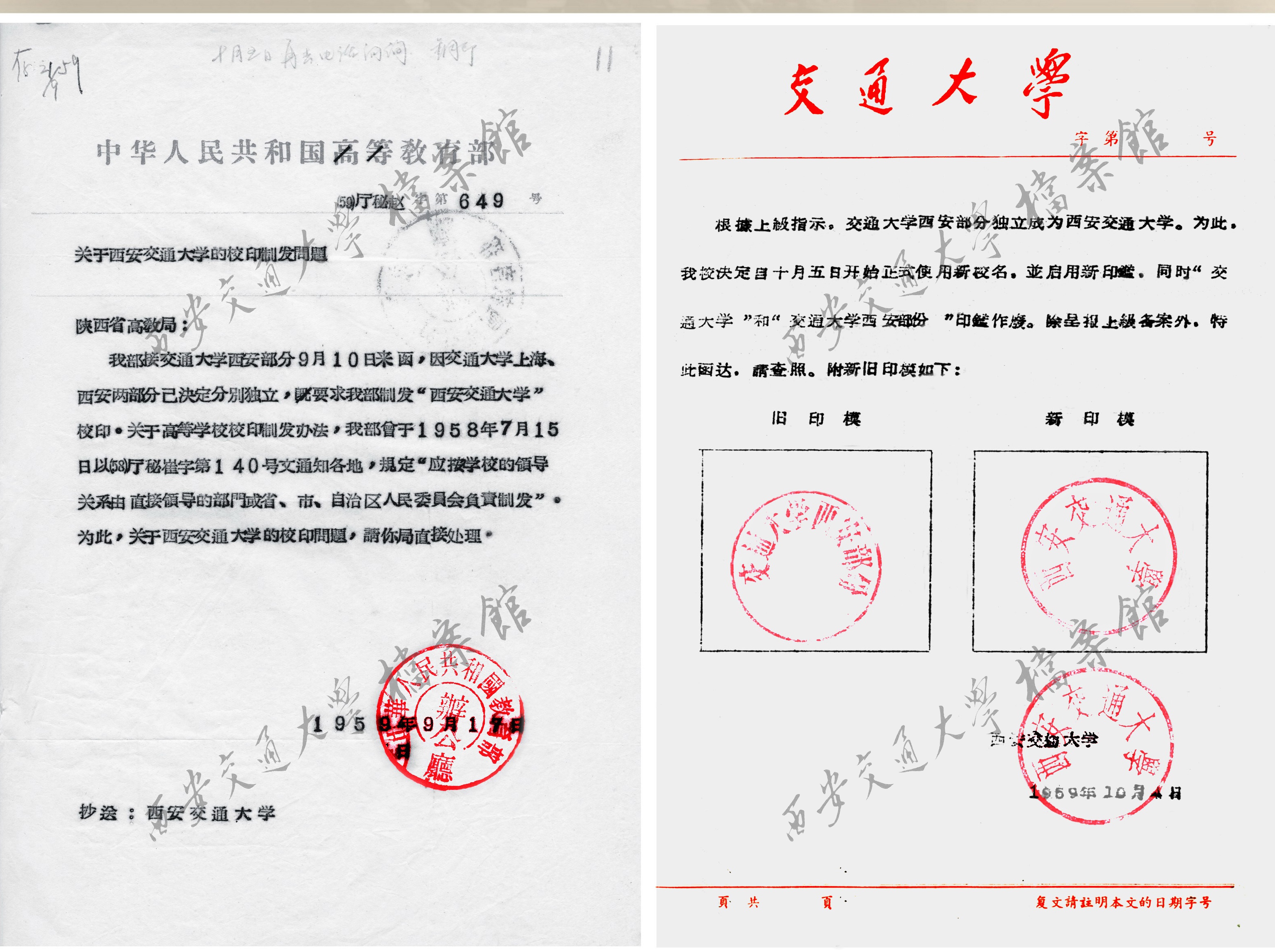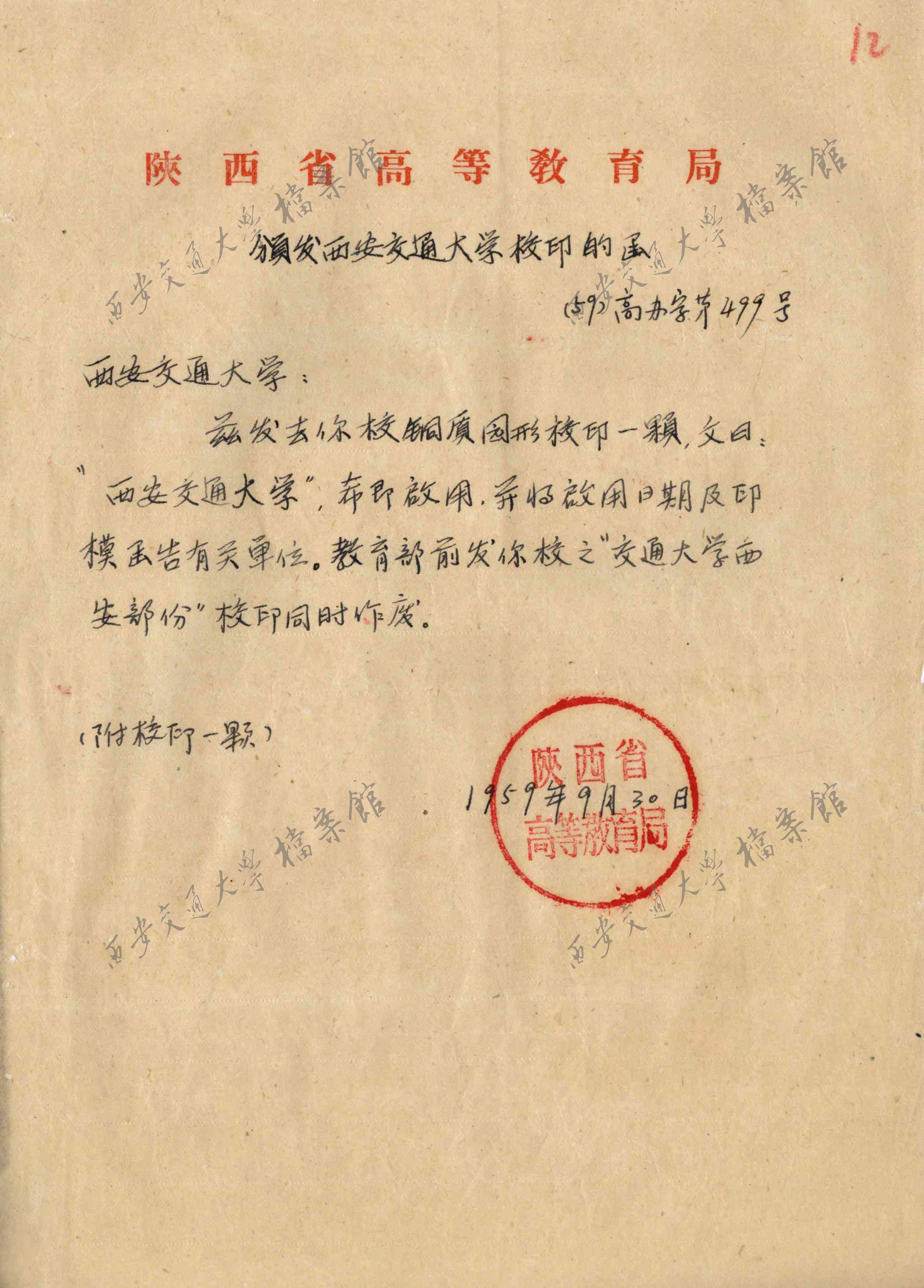 教育部发陕西省高教局——《关于西安交通大学校印制发问题函件》、《校印印模的函件》
