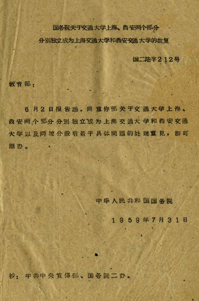 1959年7月31日,国务院“国二陆字212号”文,批复同意教育部关于交通大学上海、西安两个部分分别独立成为上海交通大学和西安交通大学,以及两校分设后若干具体问题的处理意见。同意原交通大学校长彭康同志改任西安交通大学校长。教育部报告指出:“1956年经中央批准交通大学迁往西安。嗣于1957年根据交通大学内部的实际情况及当时上海、西安两地的需要,报经国务院批准对该校迁往西安的具体方案作了调整,决定交通大学的大部分...